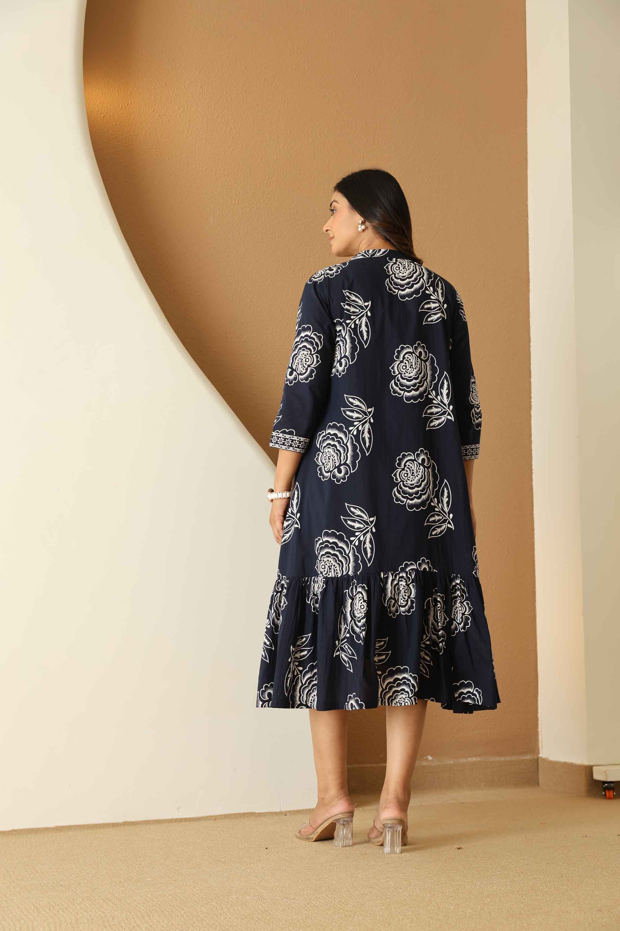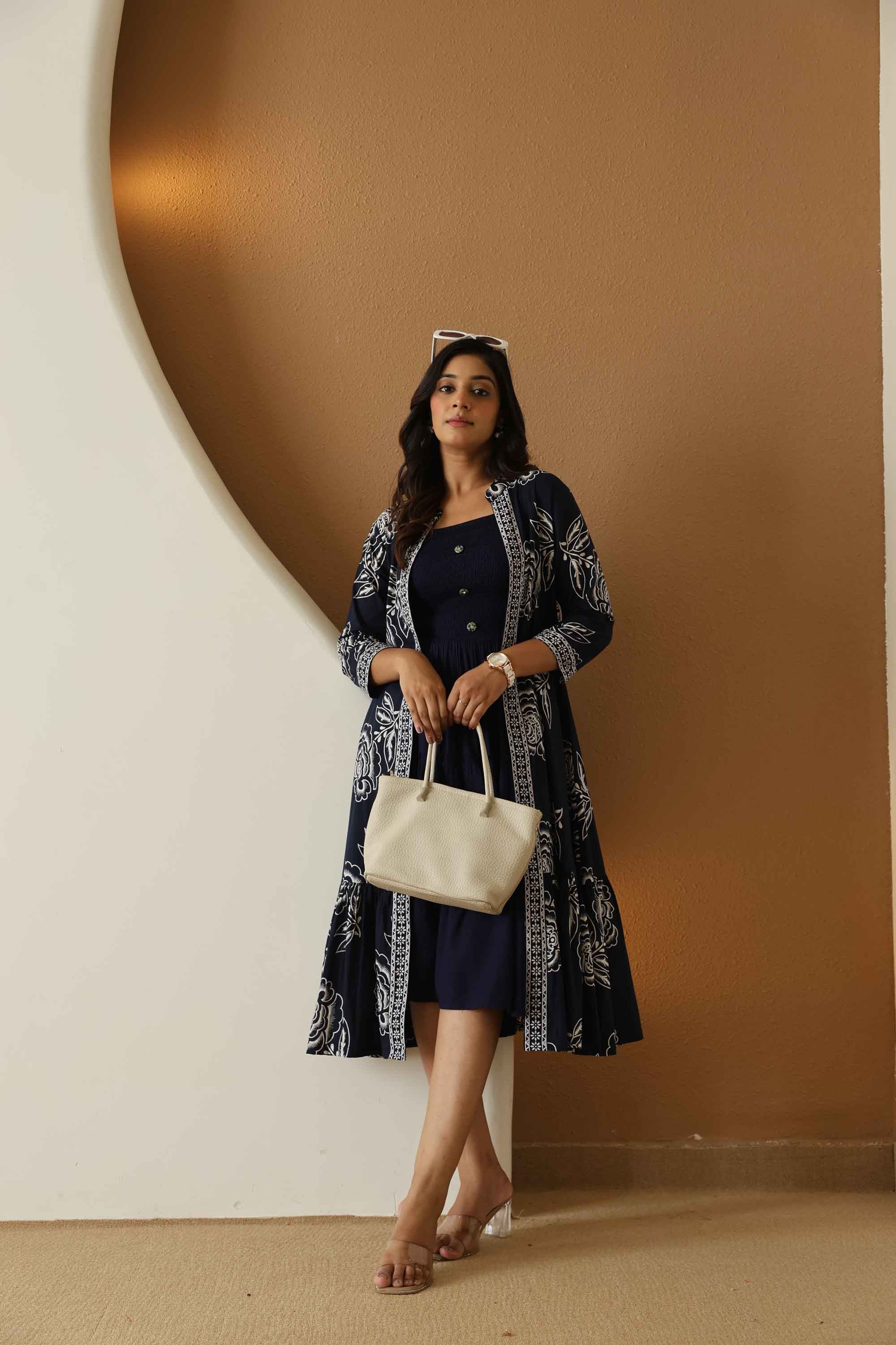 Step into effortless elegance with this sleeveless rayon midi dress paired with a cotton shrug featuring a trendy discharge print, customized buttons, bobbing elastic and 3/4th sleeves. The stylish shrug adds a graceful layered touch, making this outfit perfect for casual outings, festive wear, or semi-formal occasions. Viscose Rayon /Pure Cotton Fabric - When you slip into this dress, you’ll immediately notice the silky smooth feel of viscose rayon against your skin. This fabric is renowned for its softness and breathability, making it ideal for all-day wear. Unlike other fabrics that can feel heavy or restrictive, viscose rayon drapes beautifully, providing a flowy, lightweight sensation.
