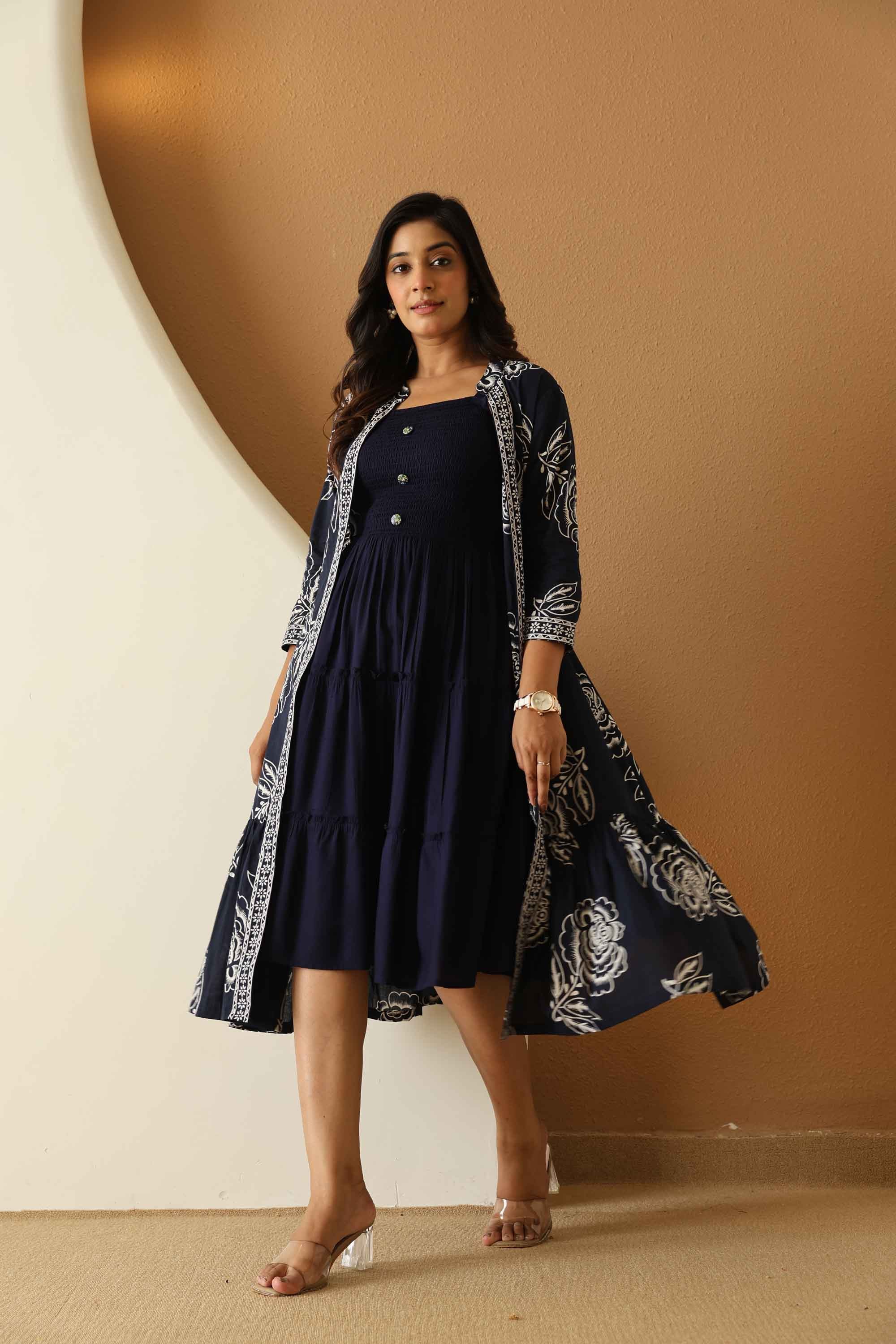 Step into effortless elegance with this sleeveless rayon midi dress paired with a cotton shrug featuring a trendy discharge print, customized buttons, bobbing elastic and 3/4th sleeves