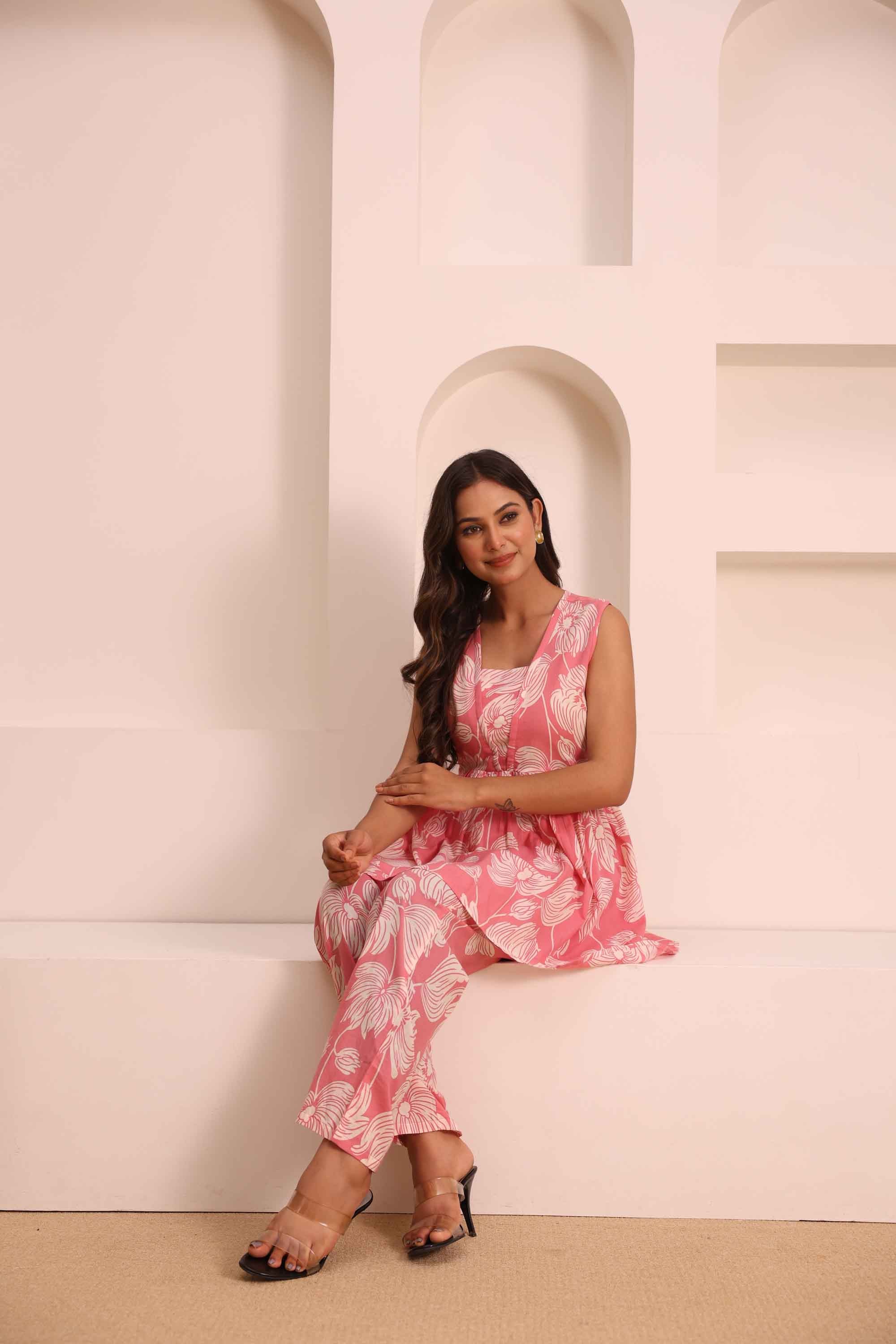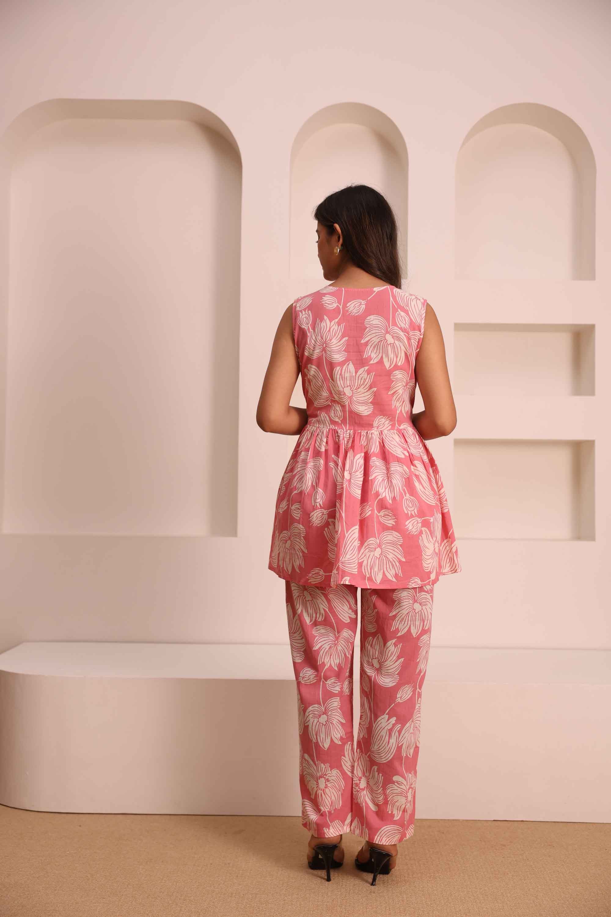 Step into a world of comfort and style with our Floral Flare Cotton Co-ord Set. Crafted from soft, breathable cotton, this set features a stunning sleeveless peplum top with a beautiful, all-over floral print