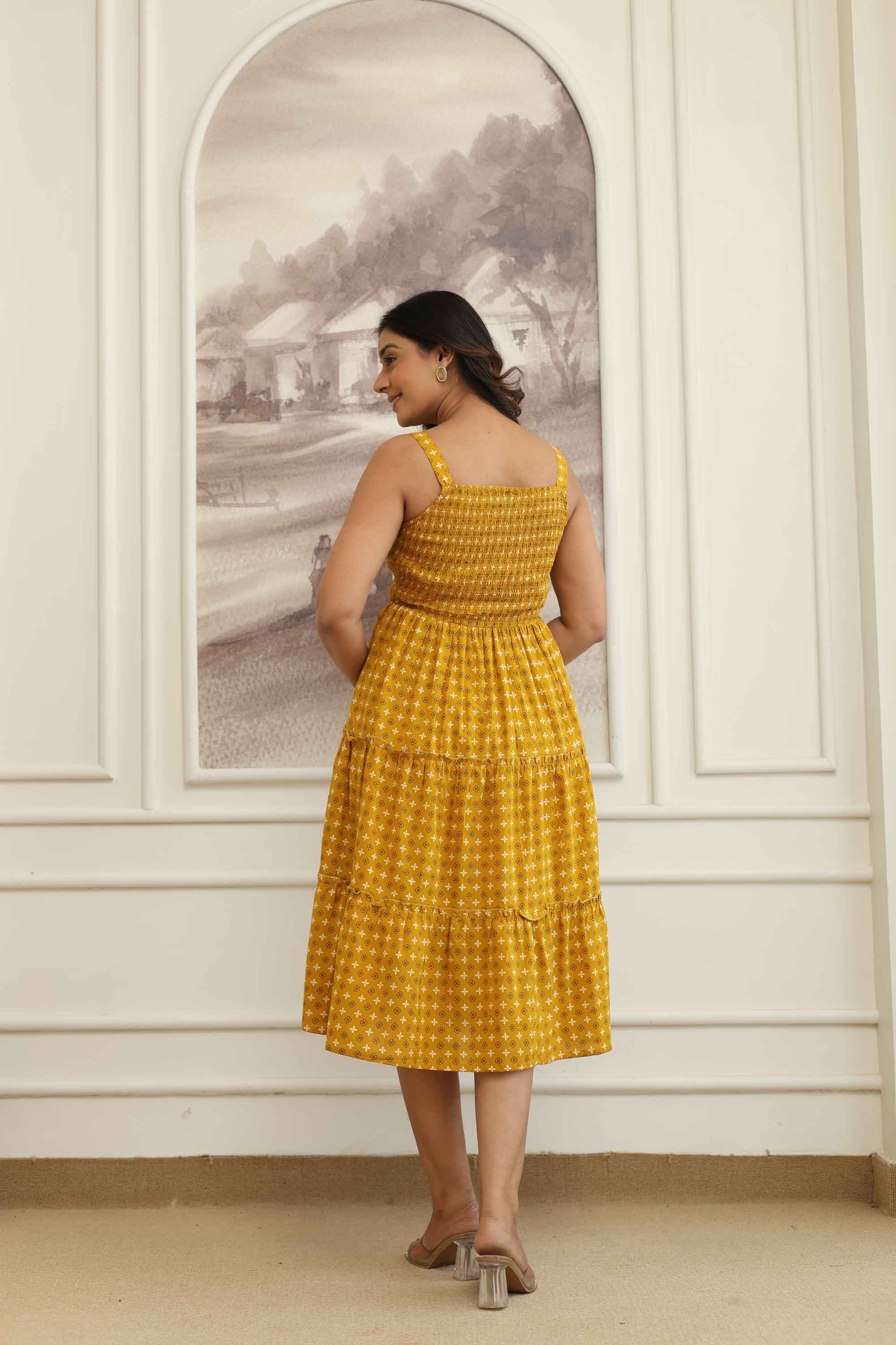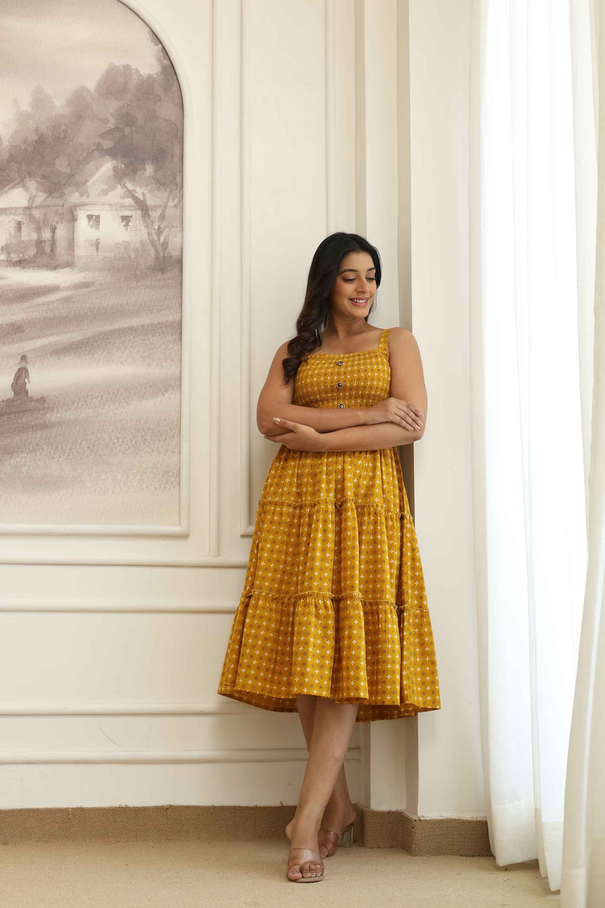 Floral prints, Fit & Flare, Midi Dress, Midis, Waist Cinch, Ruffles, Yellow Mustard Made with breathable cotton fabric, featuring discharge print and bobing elastic for a comfortable fit. The dress has customized buttons on the front for added style.