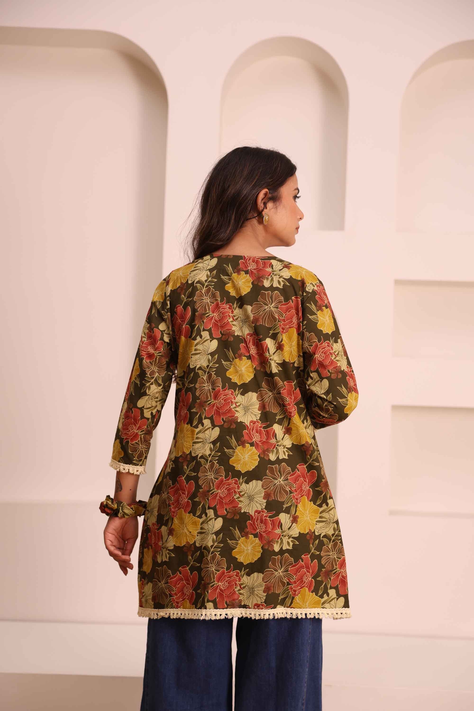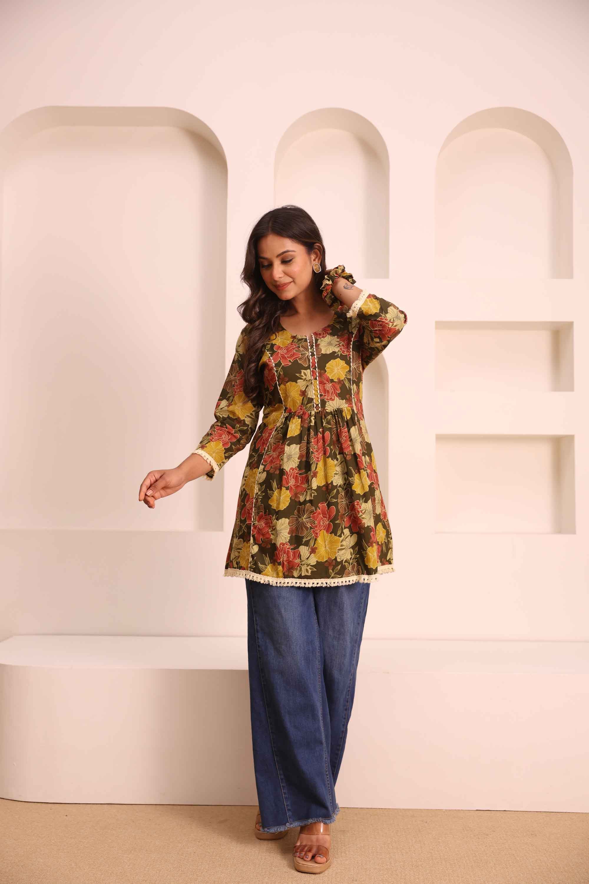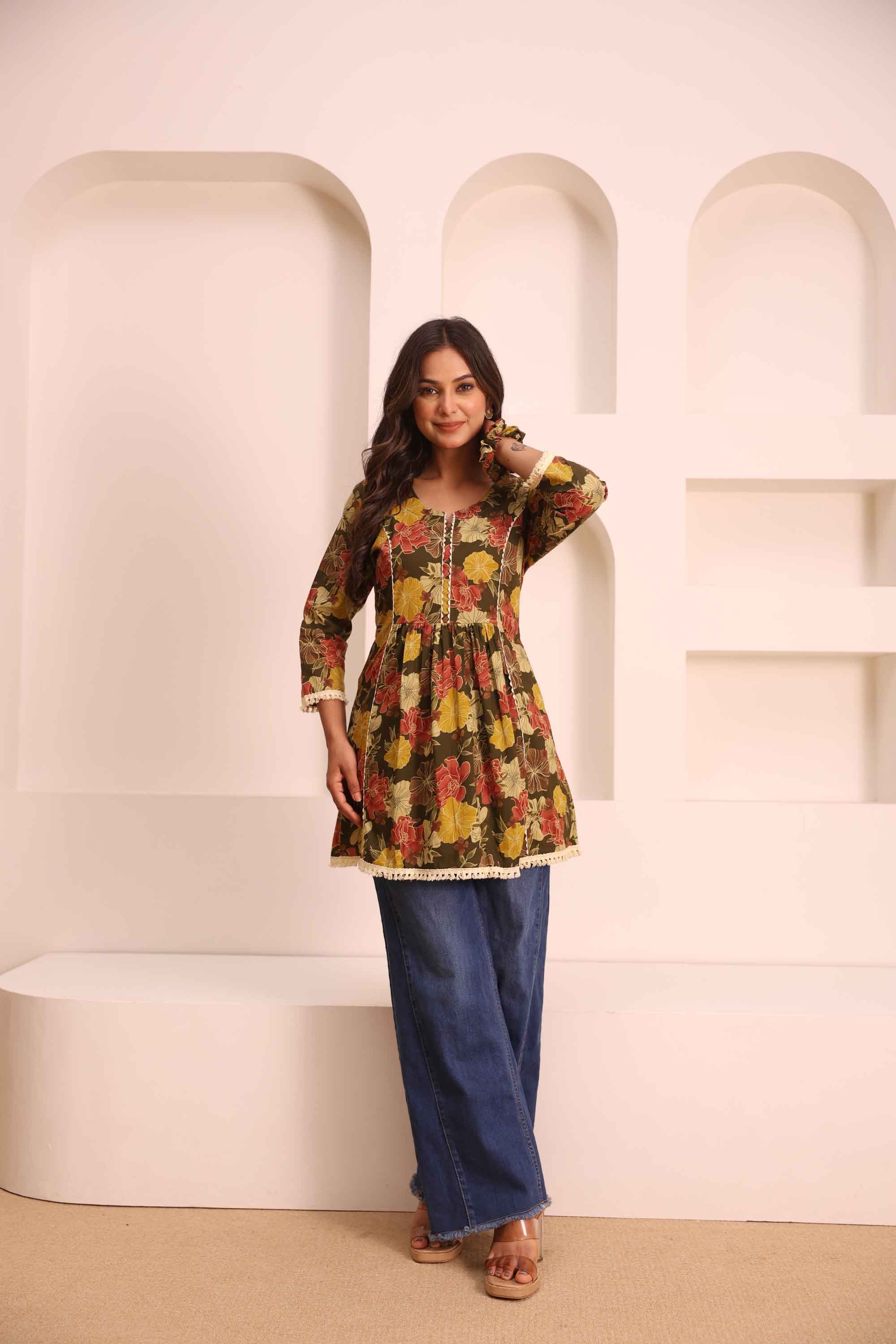 Falls gracefully at calf length with a flared hemline for added movement and charm. Elevate your everyday look with this stylish floral printed cotton kurta crafted from soft, breathable cotton fabric. The olive green base is beautifully adorned with vibrant pink and yellow floral prints, giving it a fresh and lively appeal. Featuring a round neckline with subtlelace detailing, full sleeves, and a gathered waistline for a flattering silhouette, this tunic perfectly balances comfort and elegance. The delicate lace trim at the hem and sleeve ends adds a graceful finishing touch.