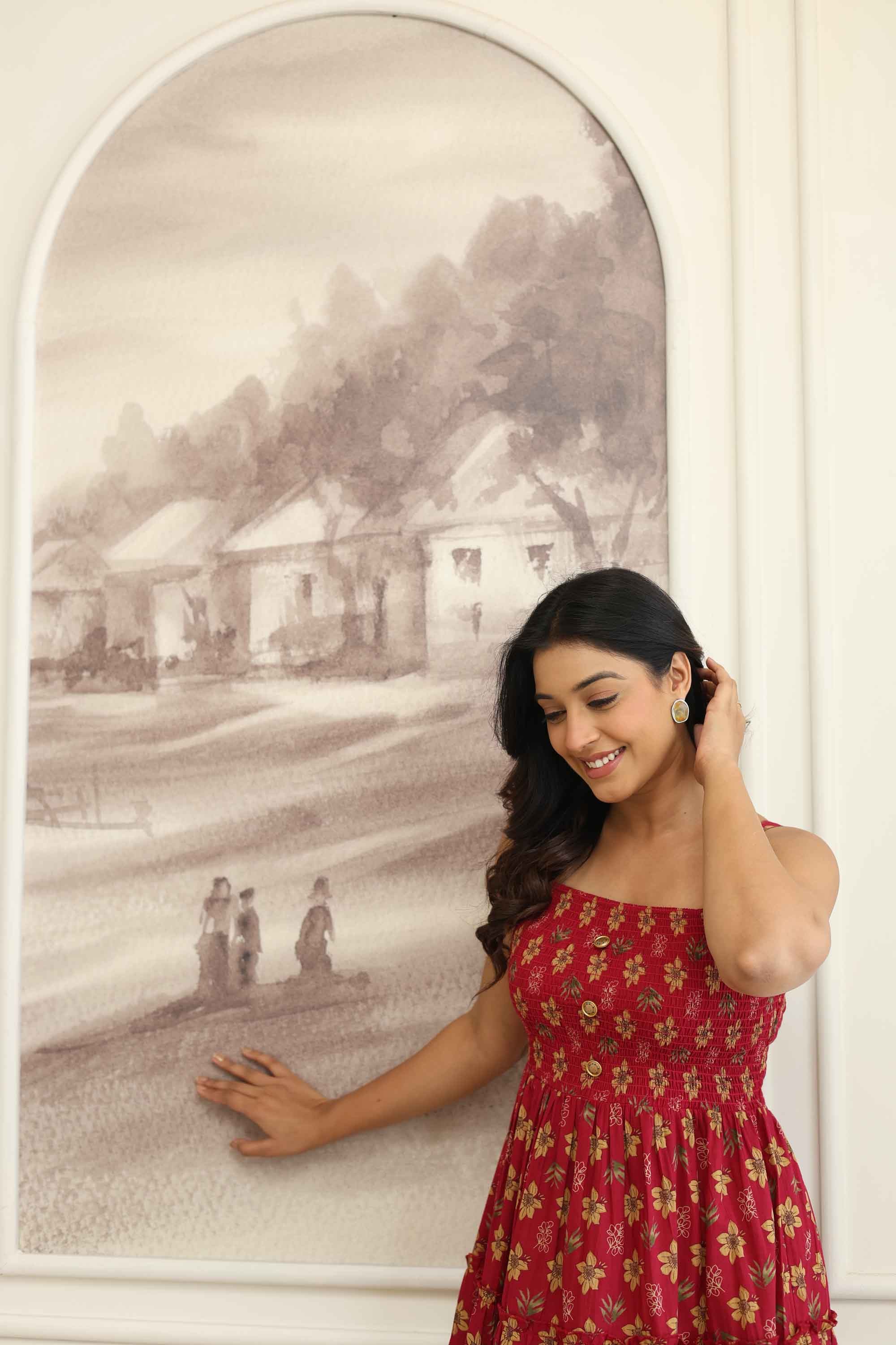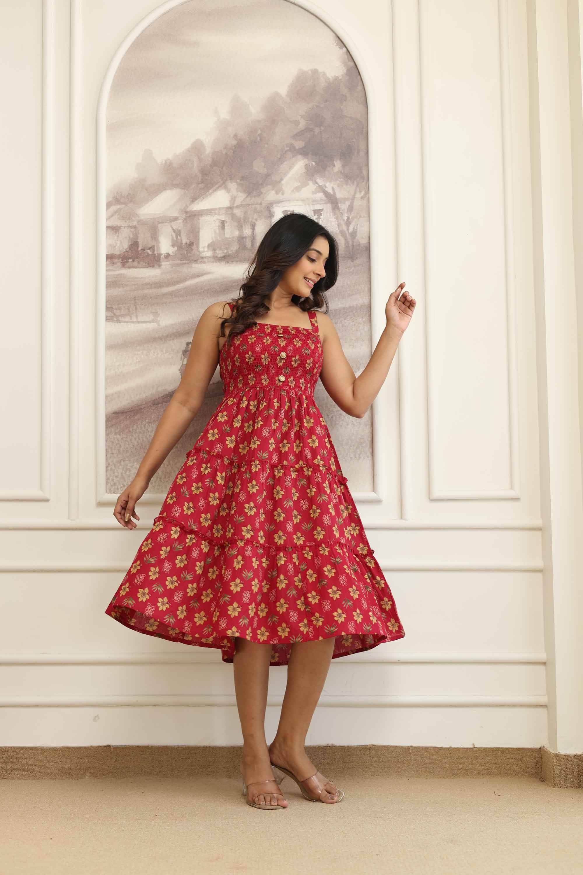 Made with breathable cotton fabric, featuring floral print and bobing elastic for a comfortable fit. The dress has customized buttons on the front for added style.